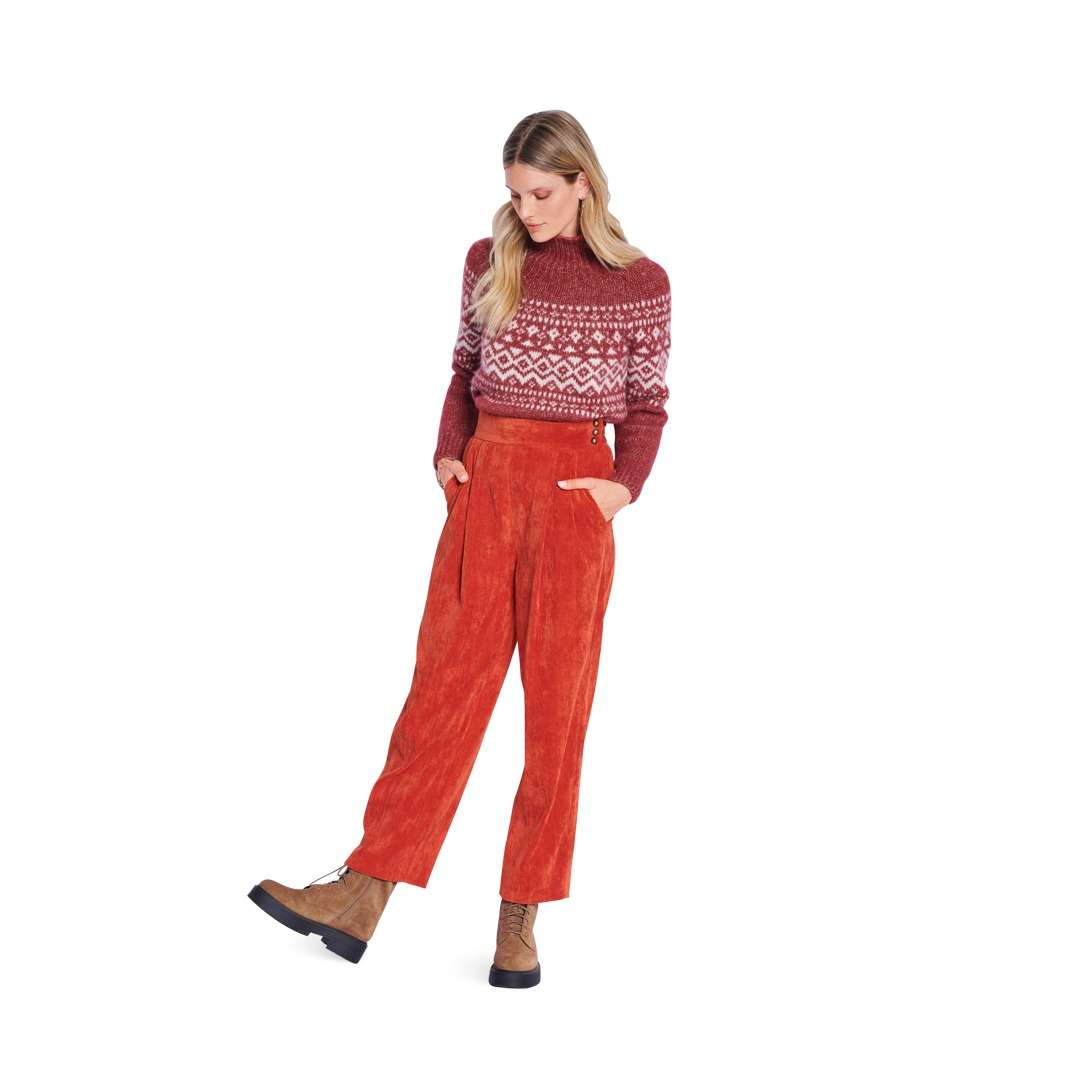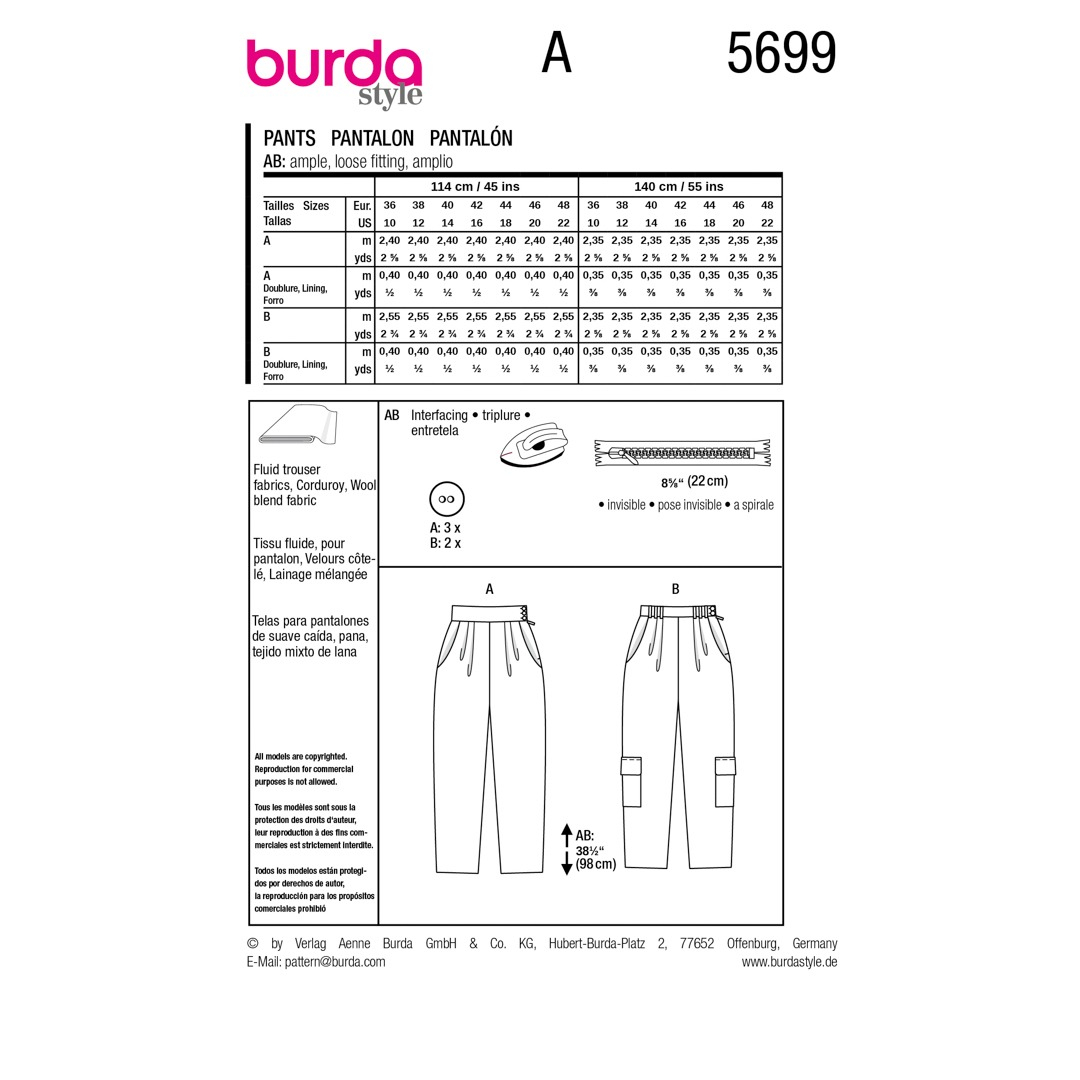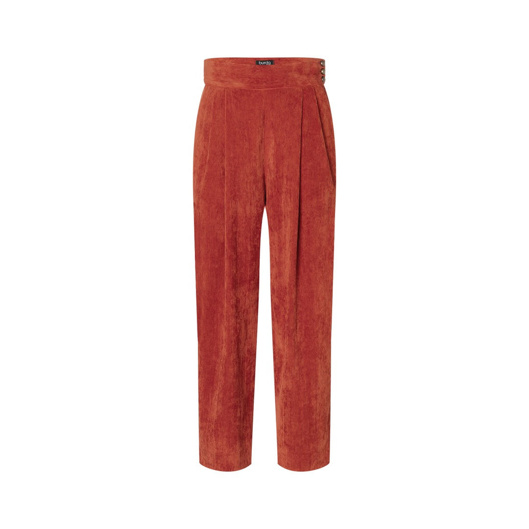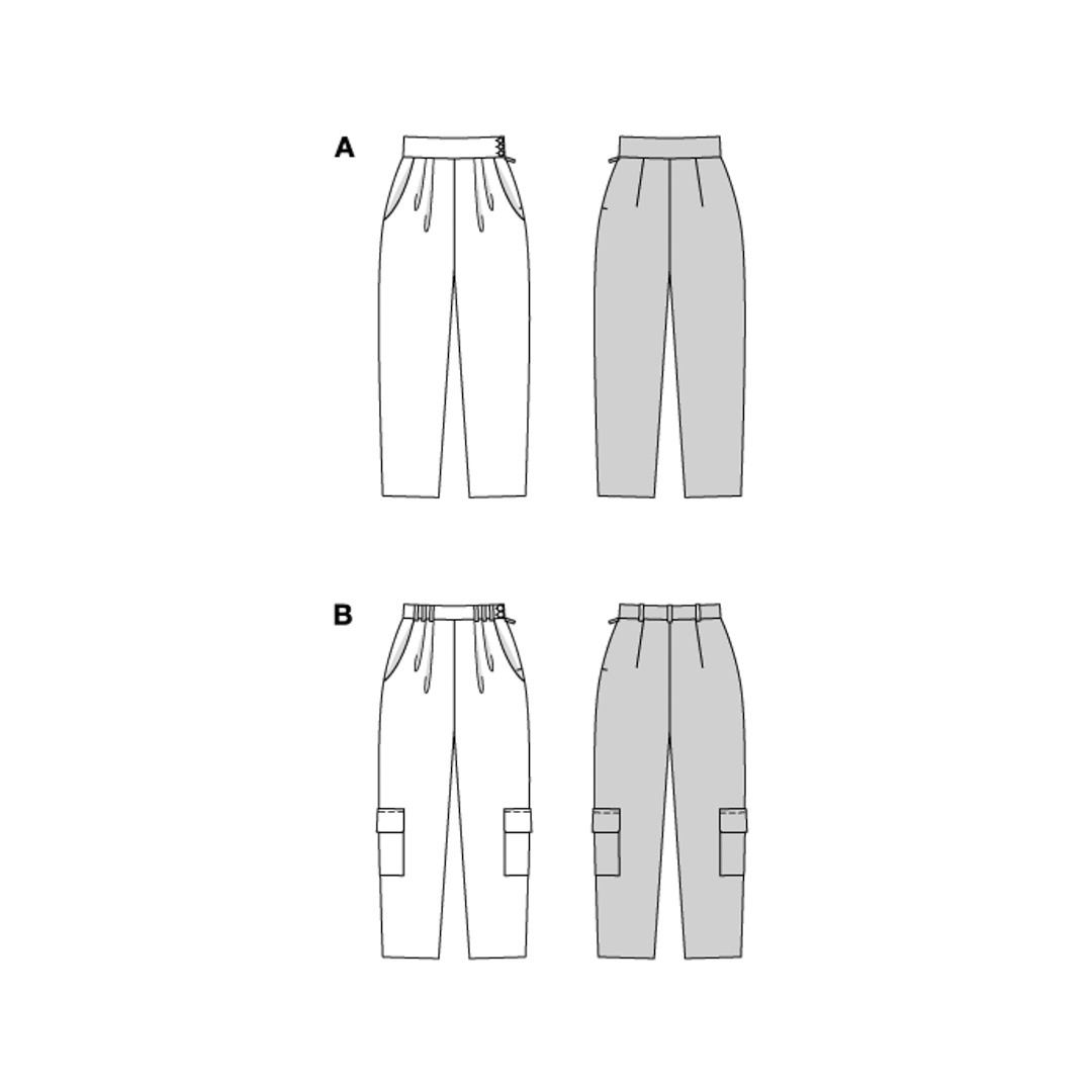 Questo modello di pantaloni offre due eleganti varianti, perfette per chi cuce per la prima volta! Il modello 1 è caratterizzato da un vivace velluto a coste in colori accattivanti, con abbottonatura laterale e ampia cintura in vita per un look audace. Il modello 2 è un raffinato modello cargo a quadri, ideale per l'ufficio, con tripli passanti per cintura e tasche XL opzionali per un tocco di stile. Entrambe le versioni sono facili da cucire e sicuramente si faranno notare!