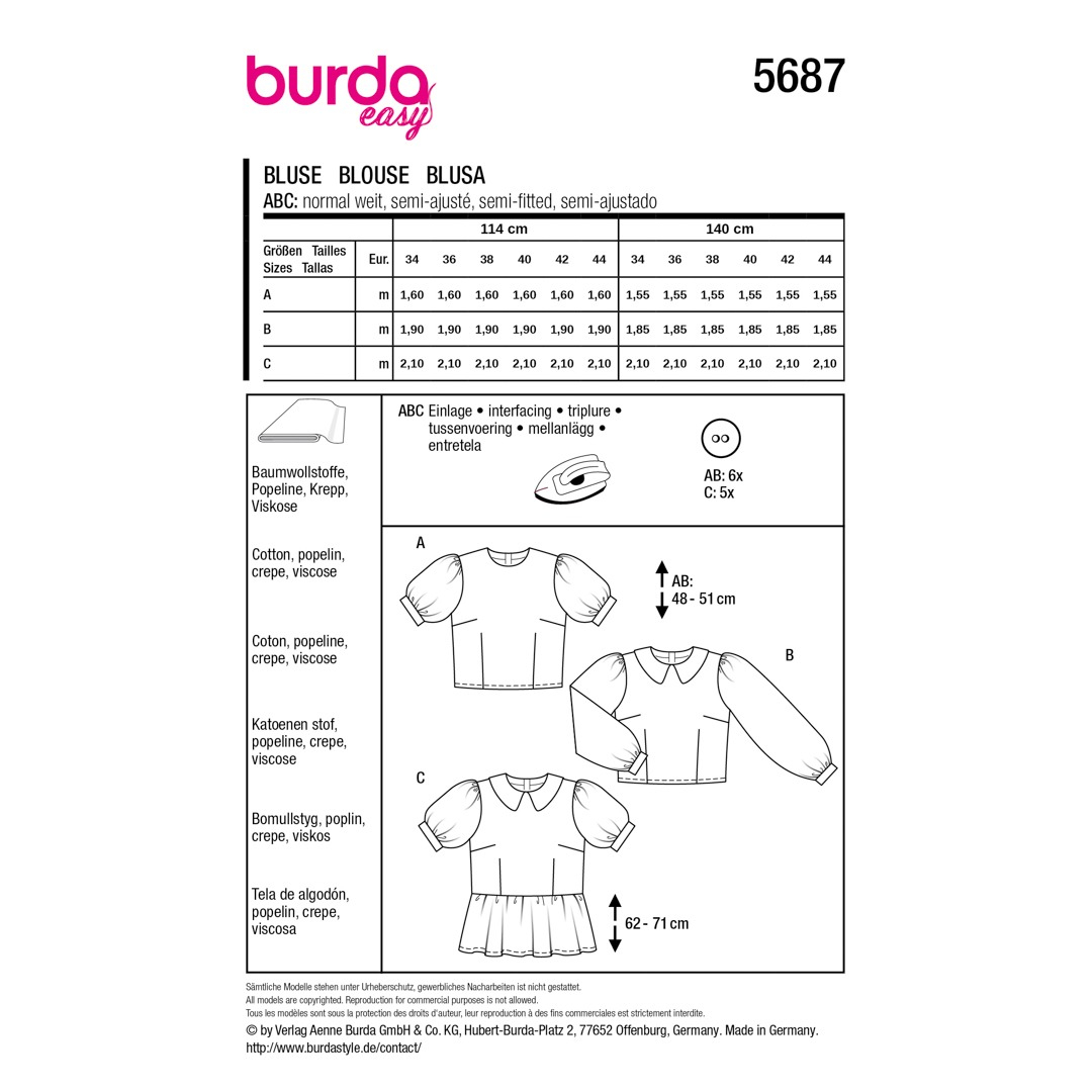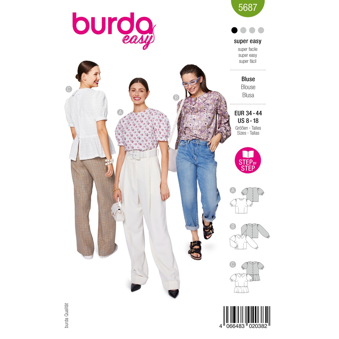 Scopri tre modelli di camicette alla moda della nostra collezione Burda Easy. Il primo modello presenta una stampa floreale diffusa e maniche a sbuffo con abbottonatura sul retro. La seconda camicetta con maniche lunghe a sbuffo e stampa floreale è ideale per l'ufficio e il tempo libero. La terza è realizzata in pregiato pizzo traforato con colletto a sbuffo e bottoni sul retro per un look grazioso.