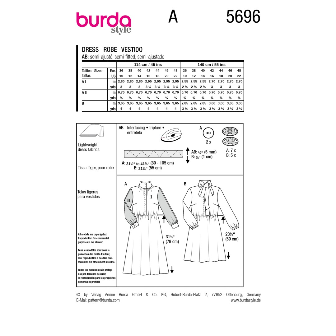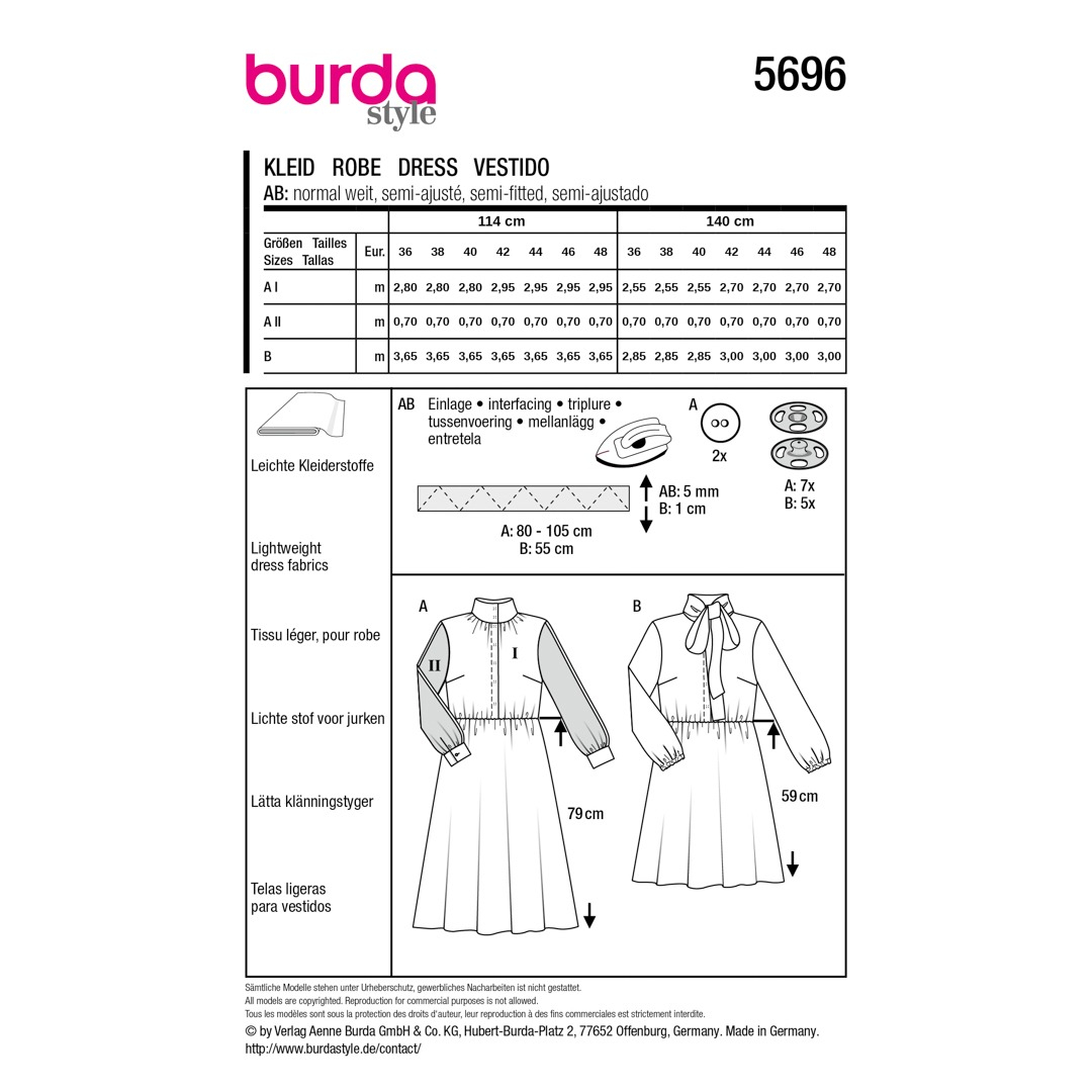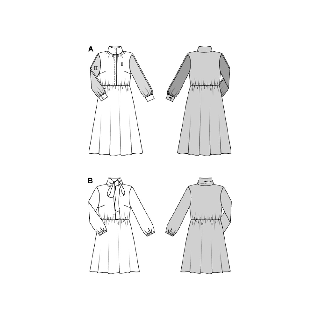 Questo modello di abito offre due varianti chic, perfette per le sarte esperte! Il primo modello fonde elementi sportivi e femminili con un colletto alto, abbottonatura nascosta e gonna a campana, il tutto impreziosito da righe colorate e color block. Il secondo modello è versatile, con risvolto e vita elasticizzata, ideale per una cena, l'ufficio o una festa. Abbinalo a un blazer e tacchi, oppure scegli un look casual con delle ballerine!