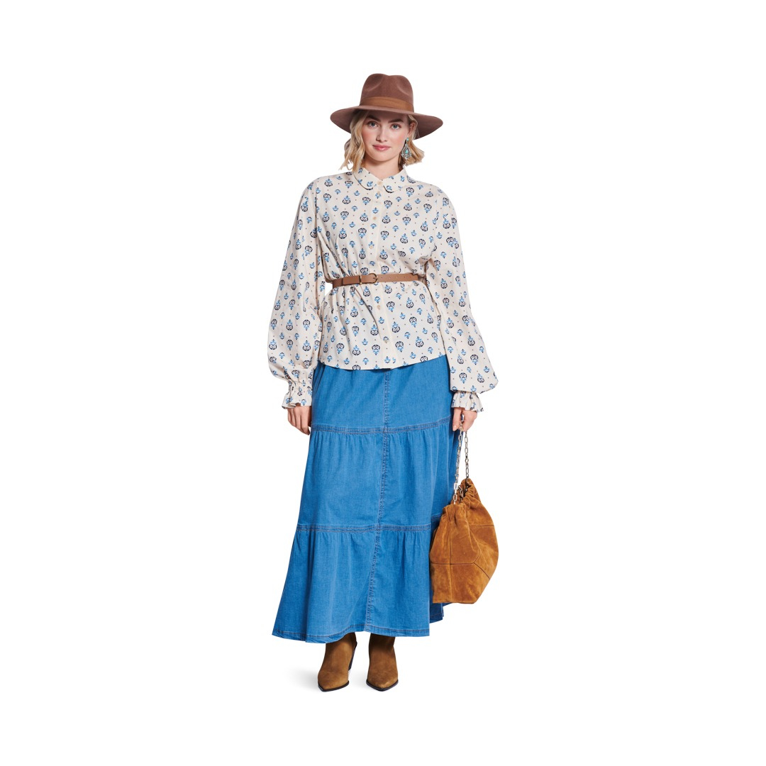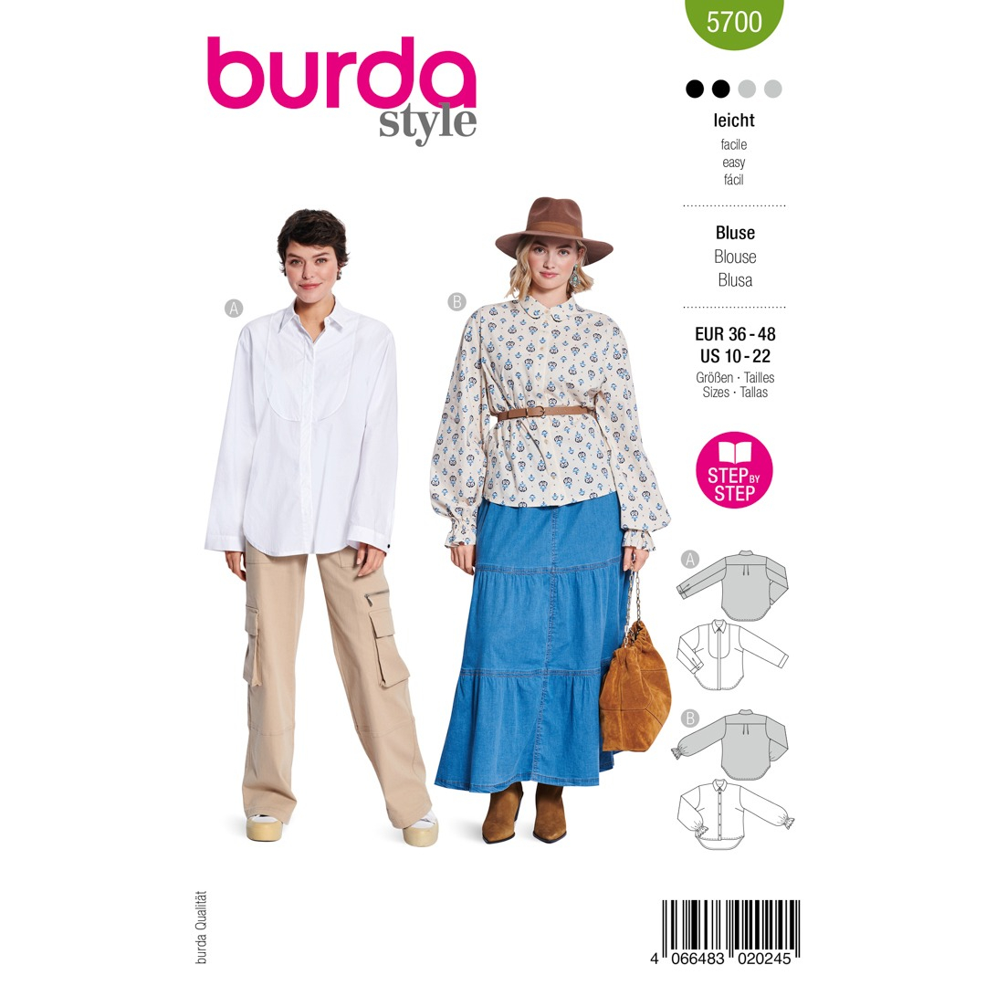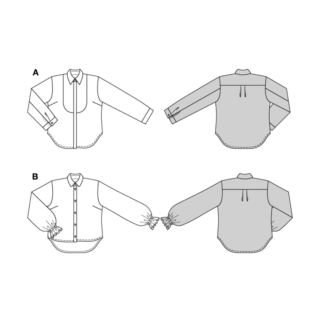 Questo modello offre due splendide varianti di camicetta! Il modello 1 incarna l'elegante stile smoking con plastron, abbottonatura nascosta e polsini ampi con bottoni vistosi, ideali per un look senza tempo. Il modello 2 presenta un taglio scandinavo rilassato con una stampa romantica e volant XL sulle maniche per un tocco giocoso. Entrambi sono facili da cucire e sicuramente faranno girare la testa!