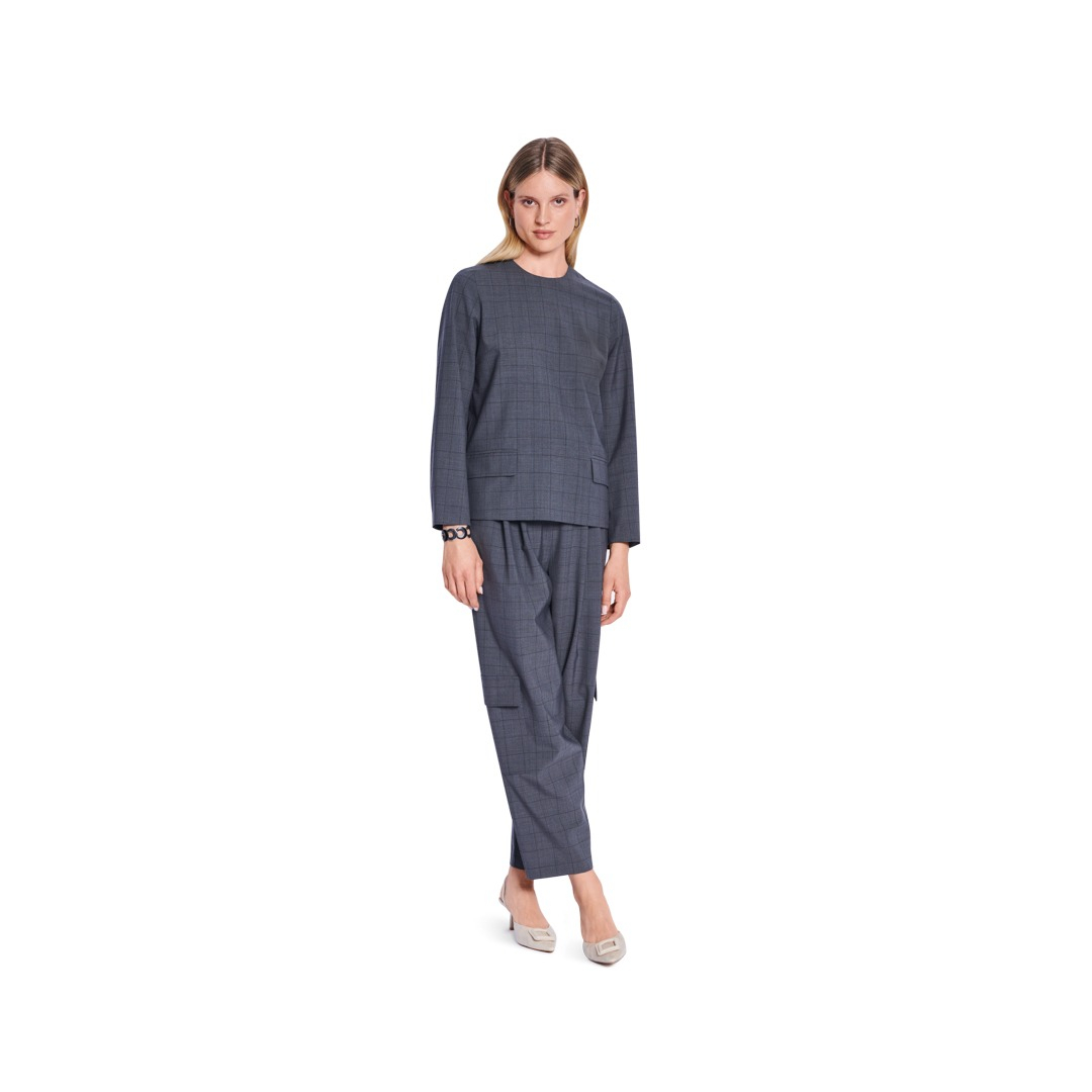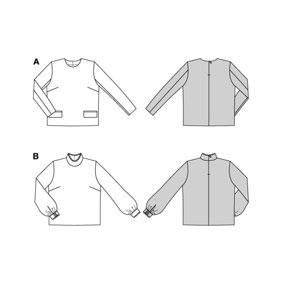 Scopri due modelli di camicette eleganti! Il modello 1 è un modello minimalista con un'elegante fantasia a quadri e pratiche tasche con patta, senza abbottonatura o colletto. La camicetta 2 aggiunge divertenti passanti lungo il collo alto e i polsini: puoi cucirli da sola o utilizzare il nastro ad anello pre-confezionato per una facile finitura. Perfetto per sarte esperte che desiderano creare capi versatili e alla moda!