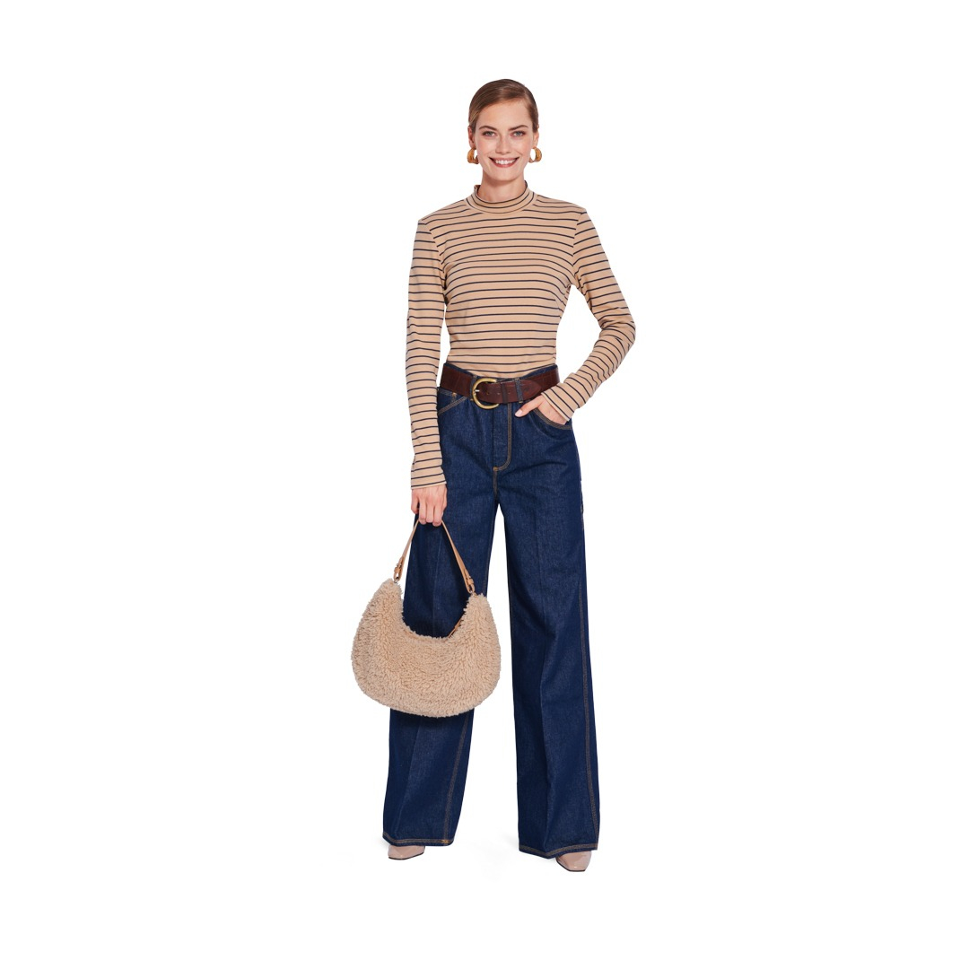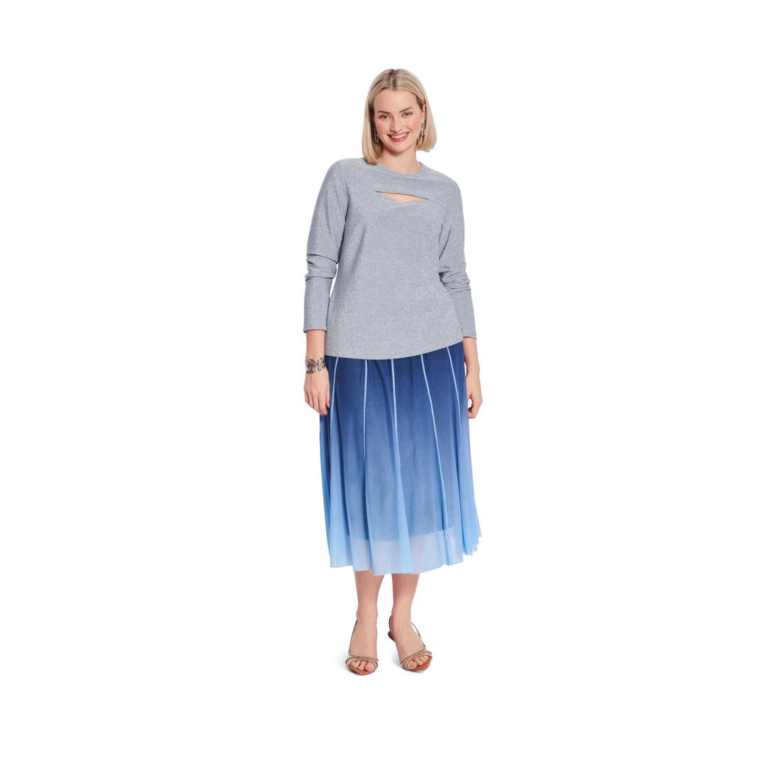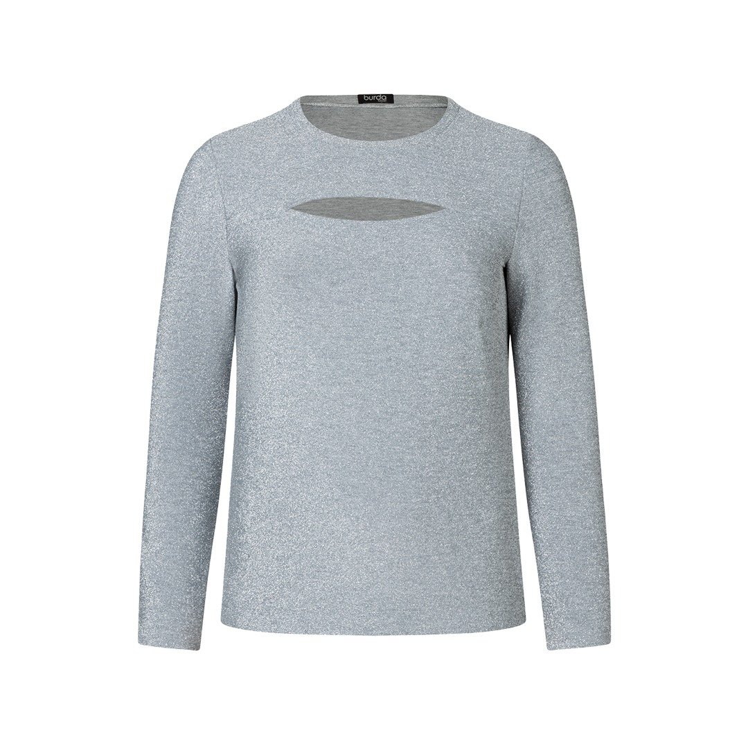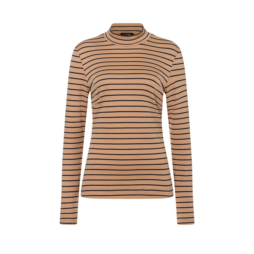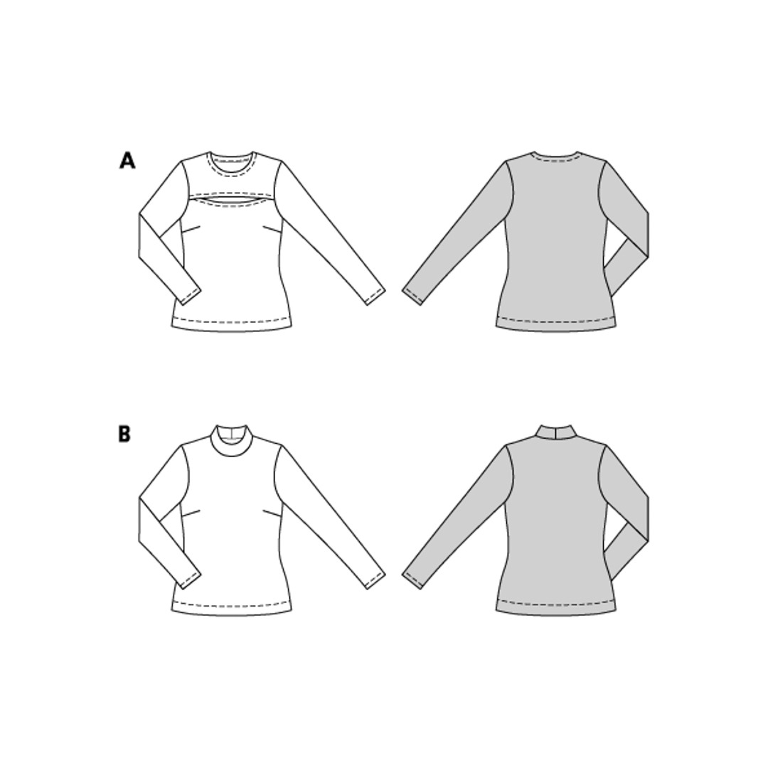 Questo modello di camicia a maniche lunghe è disponibile in due versioni, ideali per i principianti: il primo modello in maglia metallizzata con un taglio, può essere indossato sia infilato nei pantaloni che sopra la cintura: molto elegante! Il secondo modello ha un colletto alto ed è un capo basic che puoi cucire a righe, in tinta unita o con una stampa floreale: perfetto da solo o come canottiera.