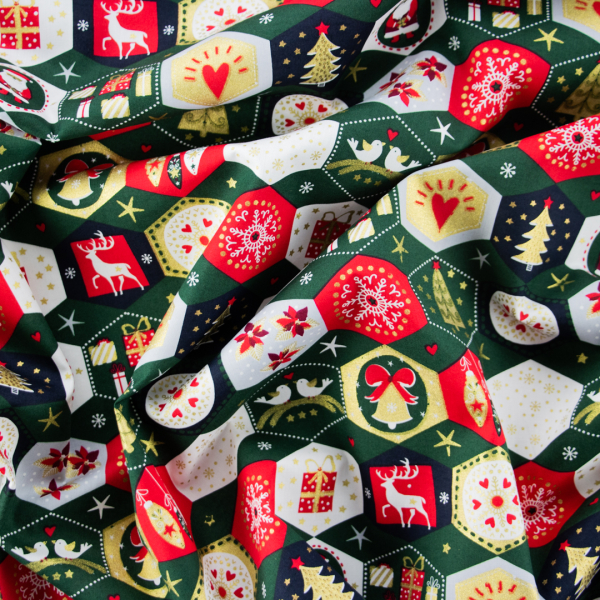 Questo tessuto stampato con fantasia natalizia, è ideale per creazioni natalizie fai da te, oggettistica homemade come ricoprire oggetti di polistirolo, sacchetti, tovaglioli, , bordi ti tovaglioli, patchwork in generale o per come "carta" per incartare i tuoi originali regali da mettere sotto l'albeo con il tocco natalizio dell'oro.