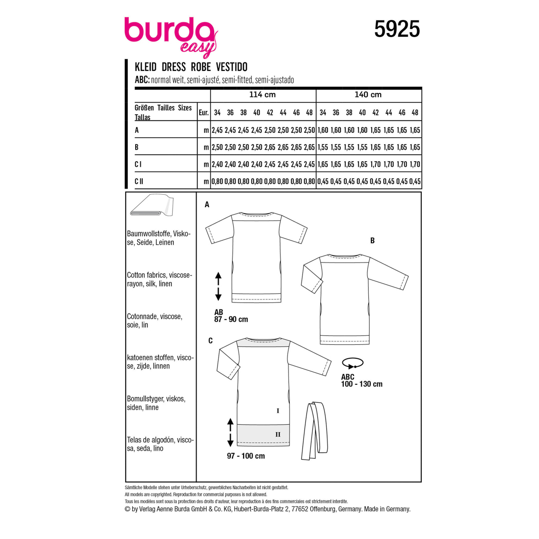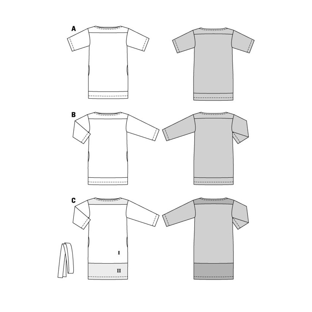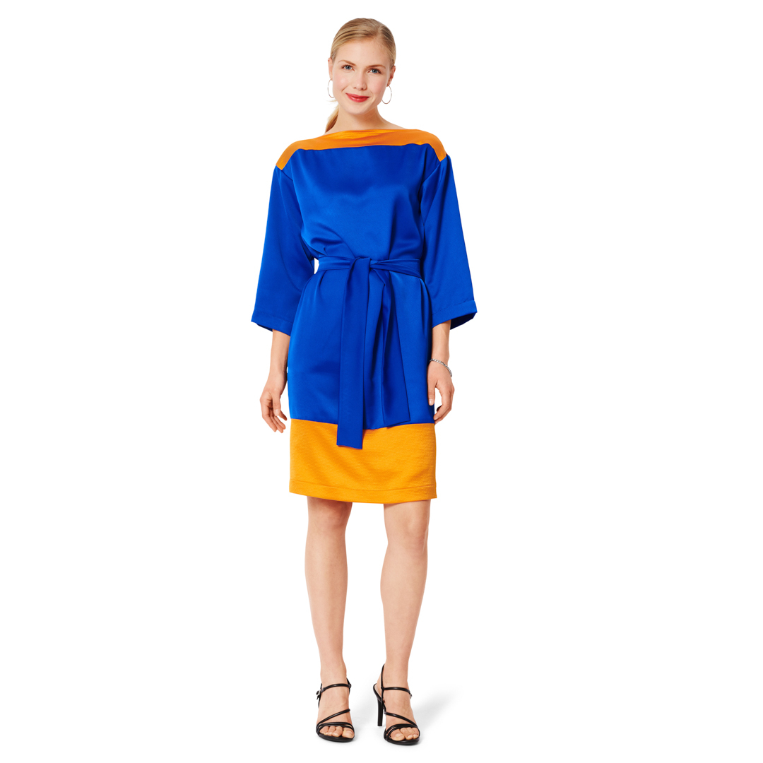 Questi abiti dal taglio dritto con scollo rotondo e tasche laterali sono un progetto ideale per principianti e ti permettono di essere creativo. Realizzato in un unico tessuto, le cuciture del pannello sono poco appariscenti. Scegli tessuti diversi e avrai un abito color block alla moda. La vista C presenta anche una cintura da annodare.