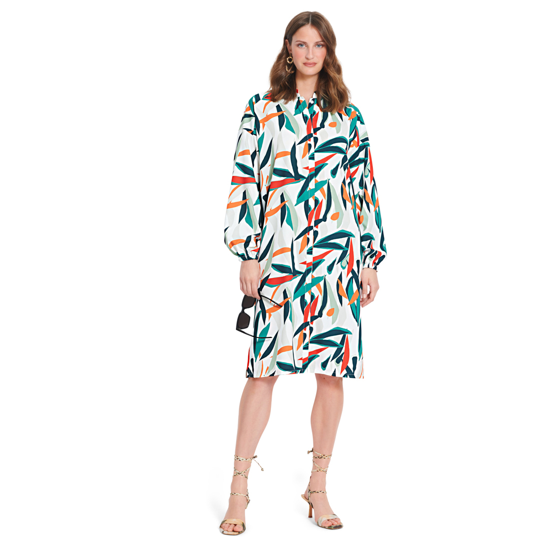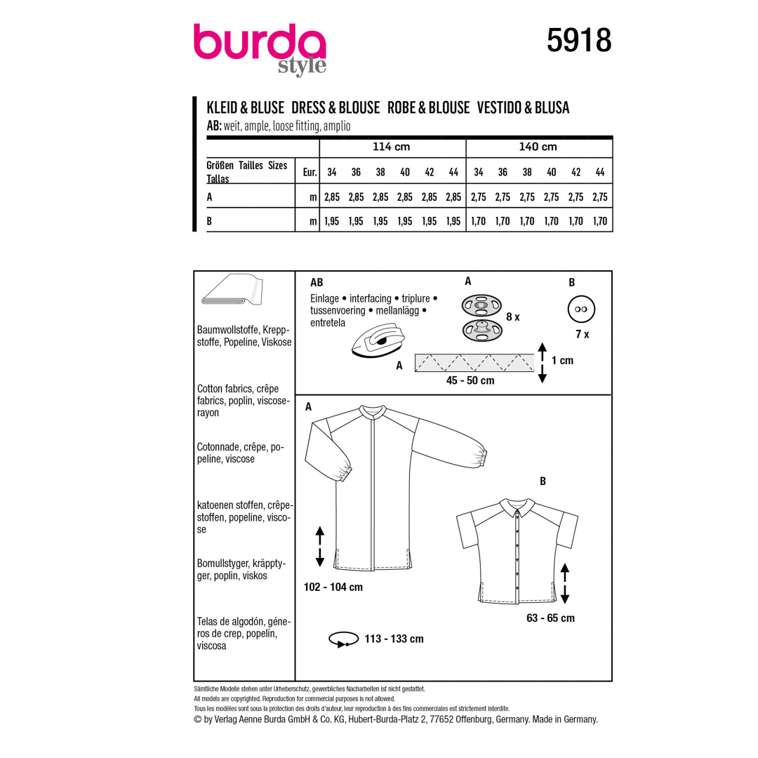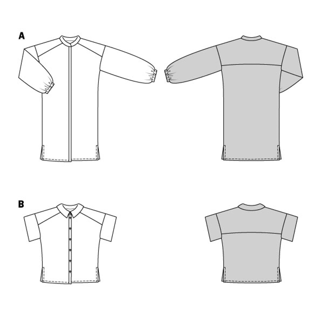 Un abito camicia e una camicia con abbottonatura frontale classica, carré largo sulle spalle e spacchi laterali. La vista del vestito A ha un collo alto e maniche lunghe e larghe con elastico al polso. La camicetta vista B ha un piccolo colletto e maniche corte.