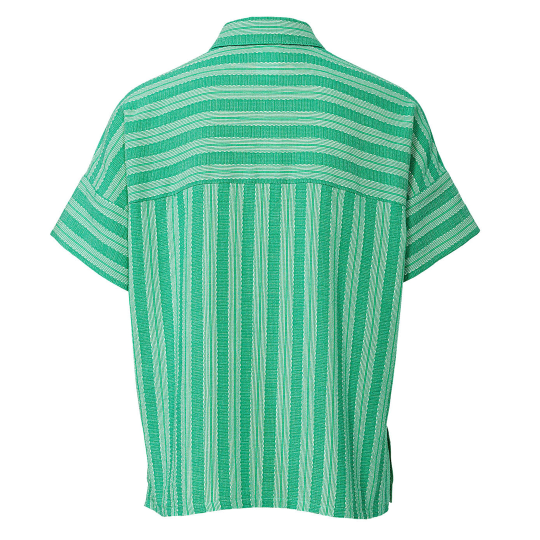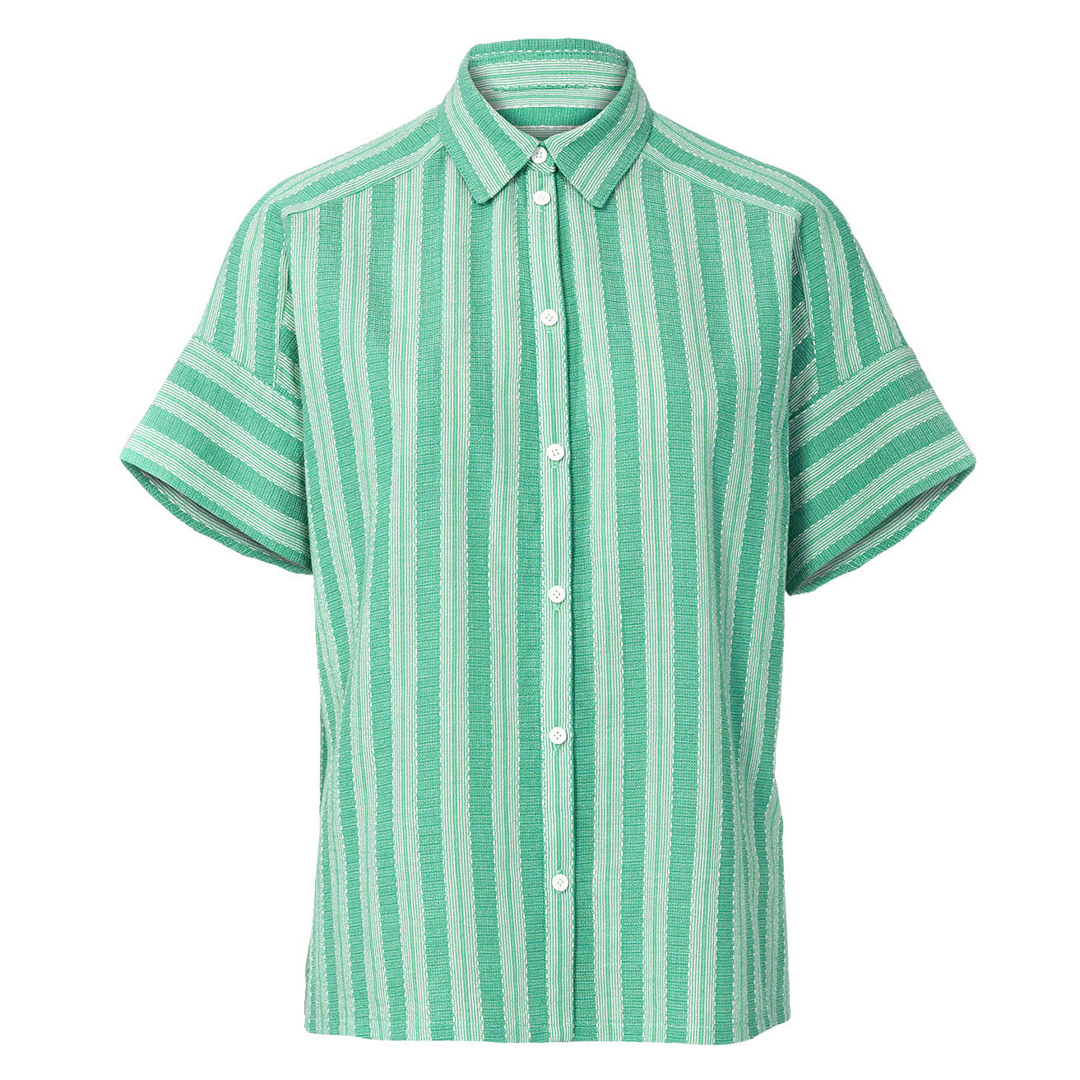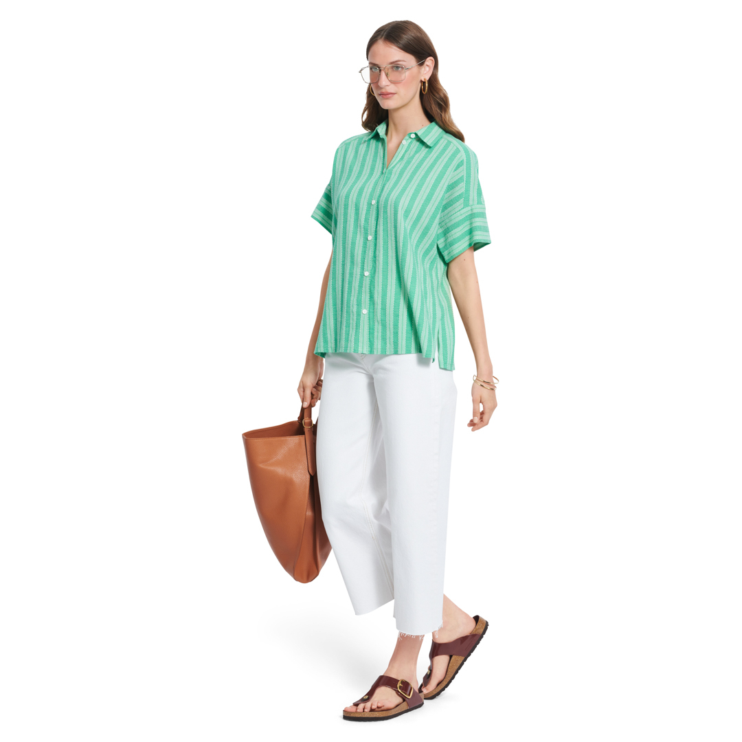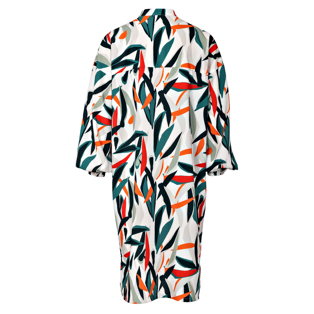 Un abito camicia e una camicia con abbottonatura frontale classica, carré largo sulle spalle e spacchi laterali. La vista del vestito A ha un collo alto e maniche lunghe e larghe con elastico al polso. La camicetta vista B ha un piccolo colletto e maniche corte.