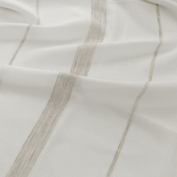 Il tessuto forma una riga verticale irregolare alternata (alterna una riga da 1cm e una riga da 5cm), tinta in filo color corda su base bianco naturale.