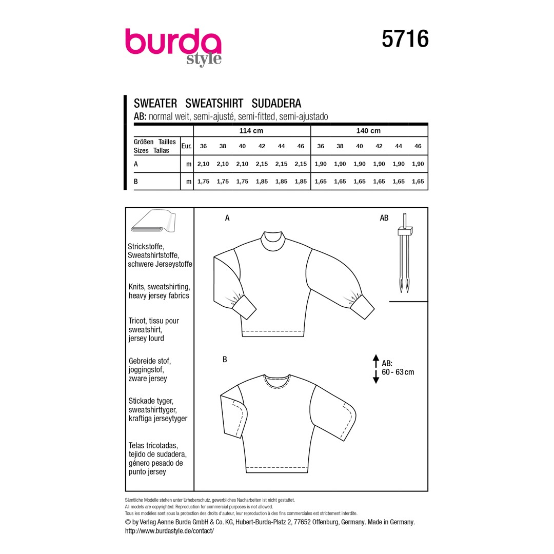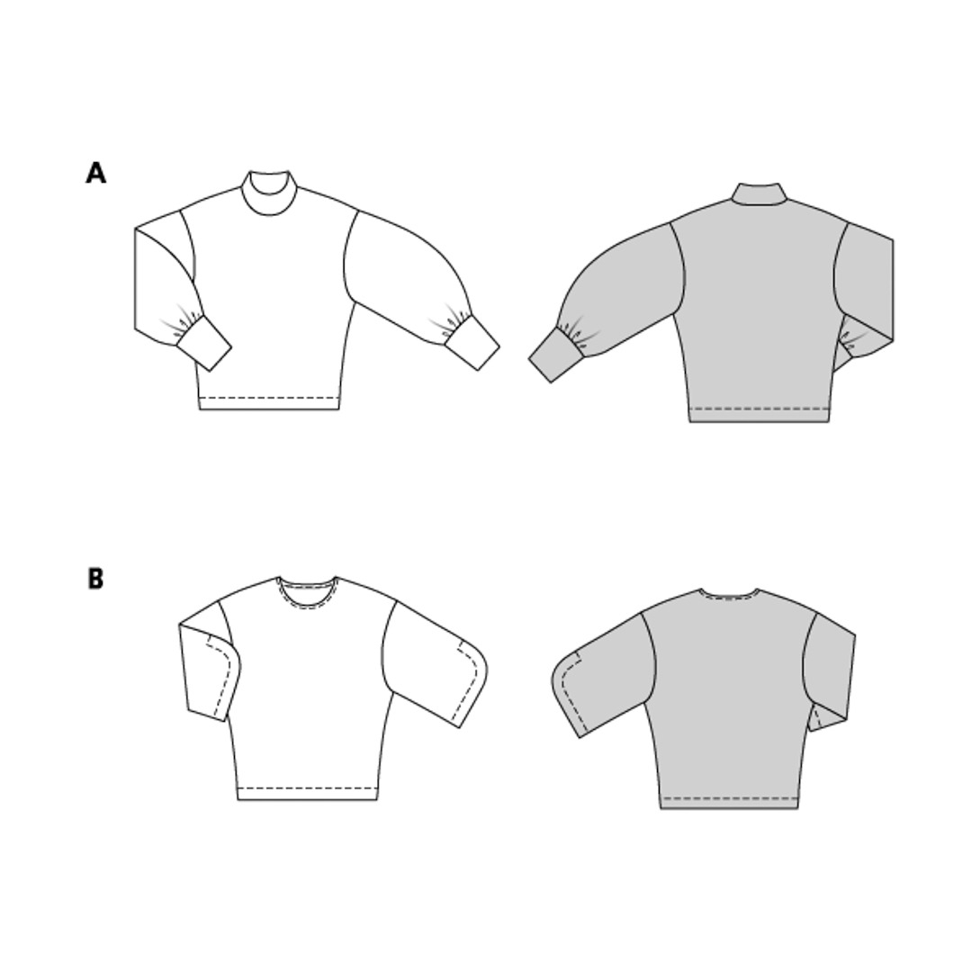 Scopri due modelli di felpa alla moda in un unico modello! La versione 1 presenta maniche super voluminose e polsini lunghi e stretti, comodi ed eleganti allo stesso tempo. La versione 2 porterà una ventata di aria fresca al tuo guardaroba con orli arrotondati e un taglio ampio. Entrambi i modelli sono facili da cucire, perfetti per tutti gli appassionati di cucito.
