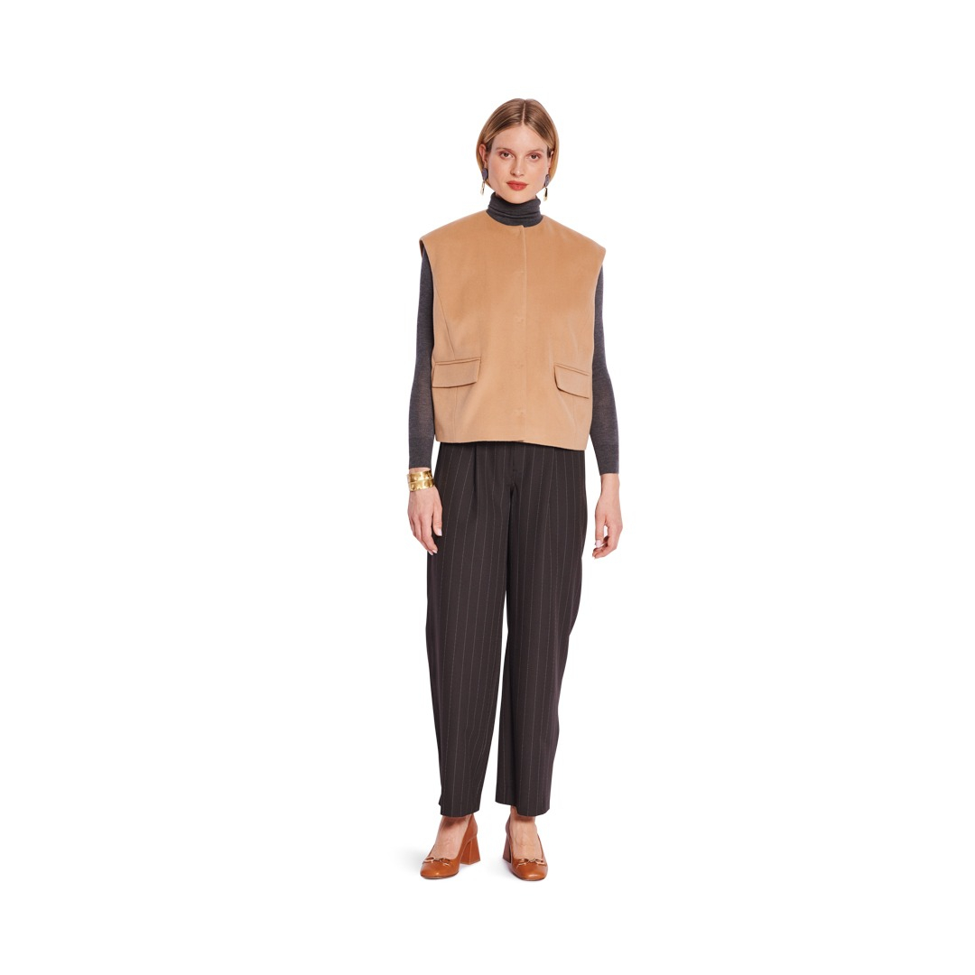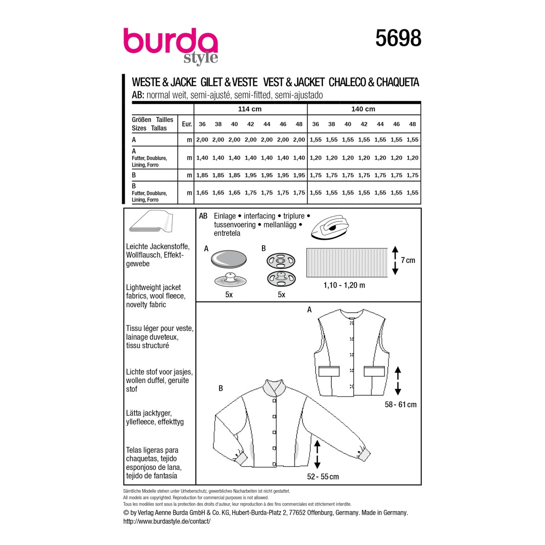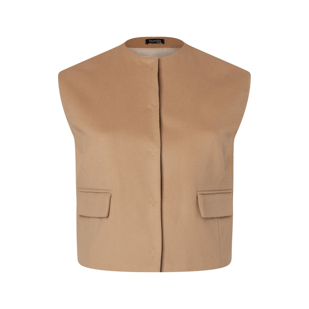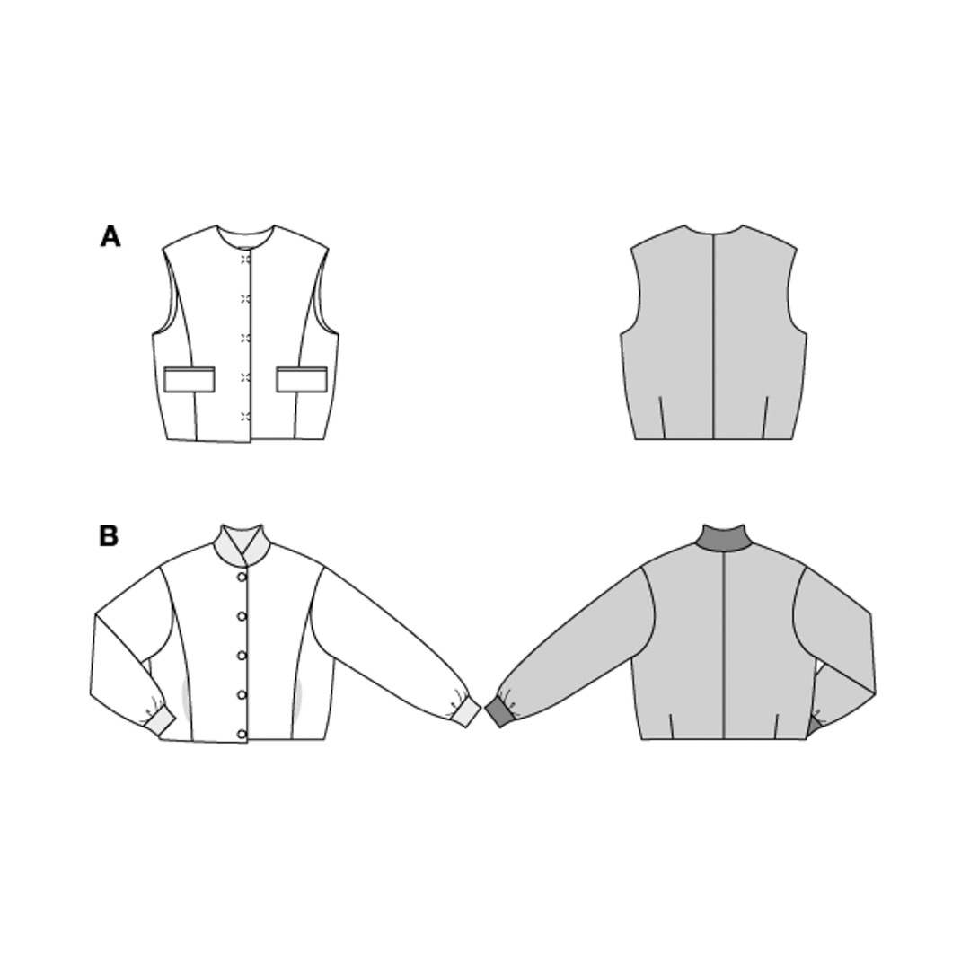 Questo modello presenta due eleganti varianti di gilet per essere esperti! Il gilet 1 fonde casual ed elegante con una schiena in stile scarabeo couture, tasche con patta precise e bottoni automatici audaci. Il modello 2 offre un'atmosfera sportiva da college con un tessuto bouclé parigino, polsini a coste, bottoni automatici e dettagli con frange. Entrambi gli stili sono eleganti ma unici, perfetti per aggiungere un tocco di stile al tuo guardaroba!
