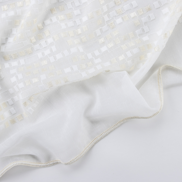 Tessuto di media pesantezza con ricami che formano fasce orizzontali, in totale quattro fasce, la prima di 25 centimetri nella parte bassa della tenda, la seconda di 15 centimetri ad una altezza di 80 centimetri, la terza di 15 centimetri all'atezza di 150 centimetri e l'ultima ad un altezza di 2,00 m larga 5 centimetri.