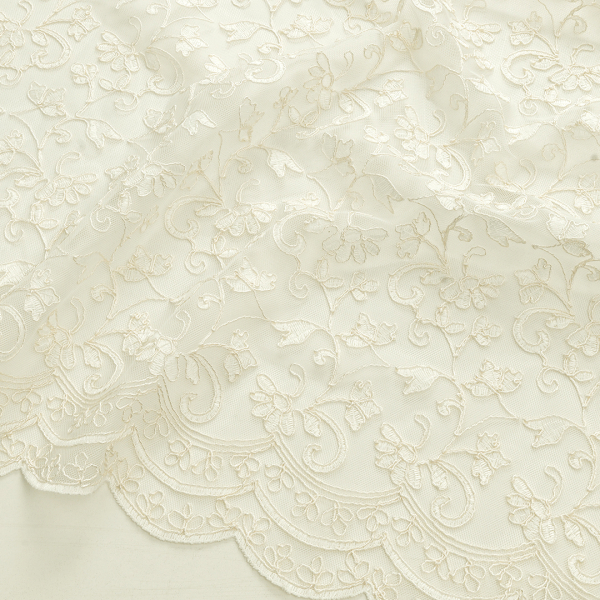 DescrizioneTenda in poliestere in base di tulle ricamato in altezza 3 metri.