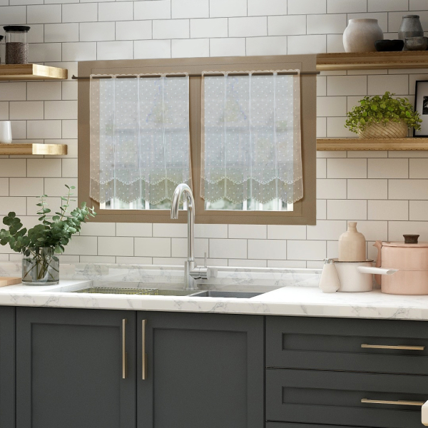 Tessuto in poliestere a pannelli prefiniti di color naturale. La tenda ha dei pois nell'altezza, una rifinitura nel fondo a smerlo e dei fori prefiniti per il passaggio del bastoncino di fissaggio.