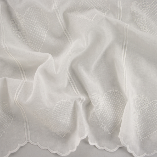 Tessuto in poliestere a pannelli prefiniti di color naturale. La tenda ha dei cuori ricamati in tinta, una rifinitura nel fondo a smerlo e dei fori prefiniti per il passaggio del bastoncino di fissaggio.