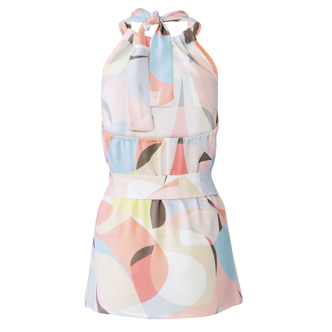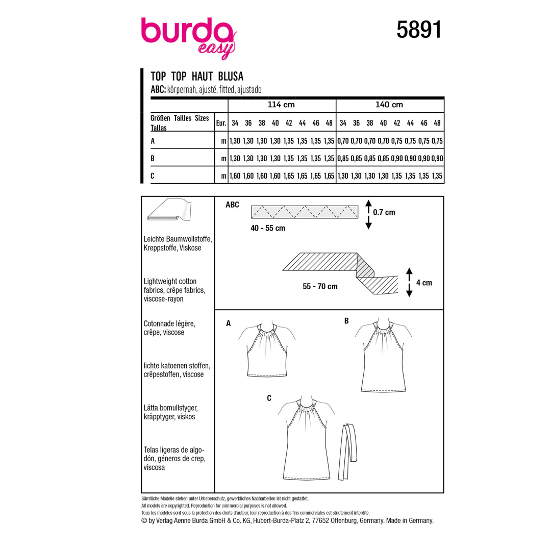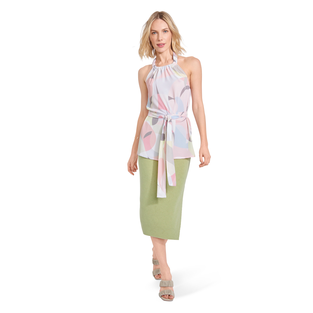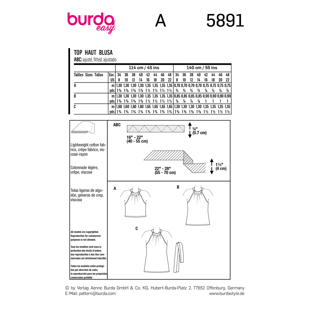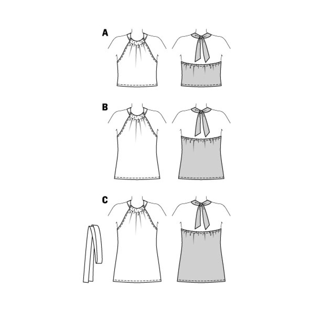 Fun halter tops in tre diverse lunghezze. Vista A è leggermente corto, vist B è di lunghezza regolare, vista C copre i fianchi ed ha una stringa da annodare. Tutti e tre sono elasticizzati sul retro per una buona vestibilità ed hanno una fascia dello stesso tessuto per annodare la parte anteriore dietro il collo.