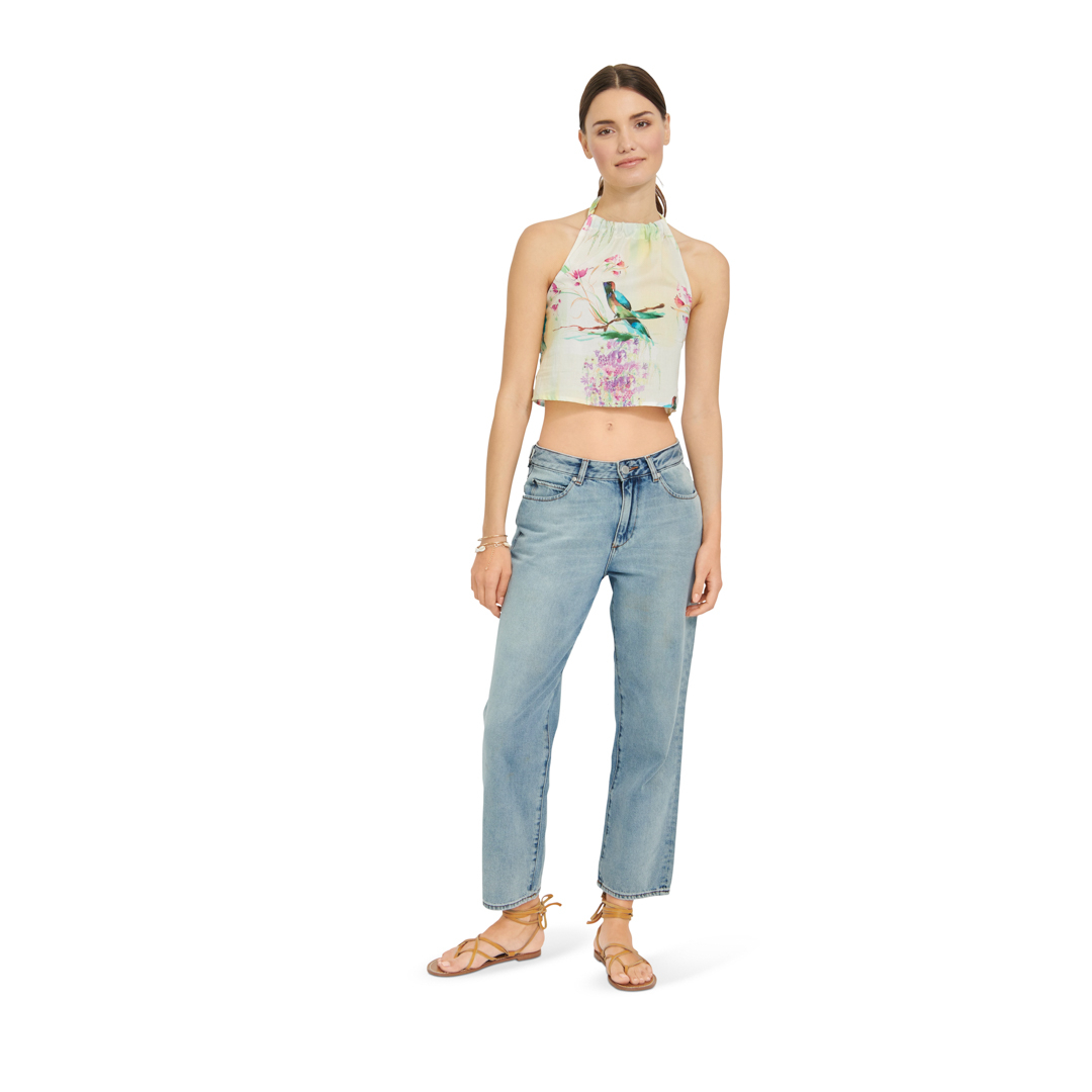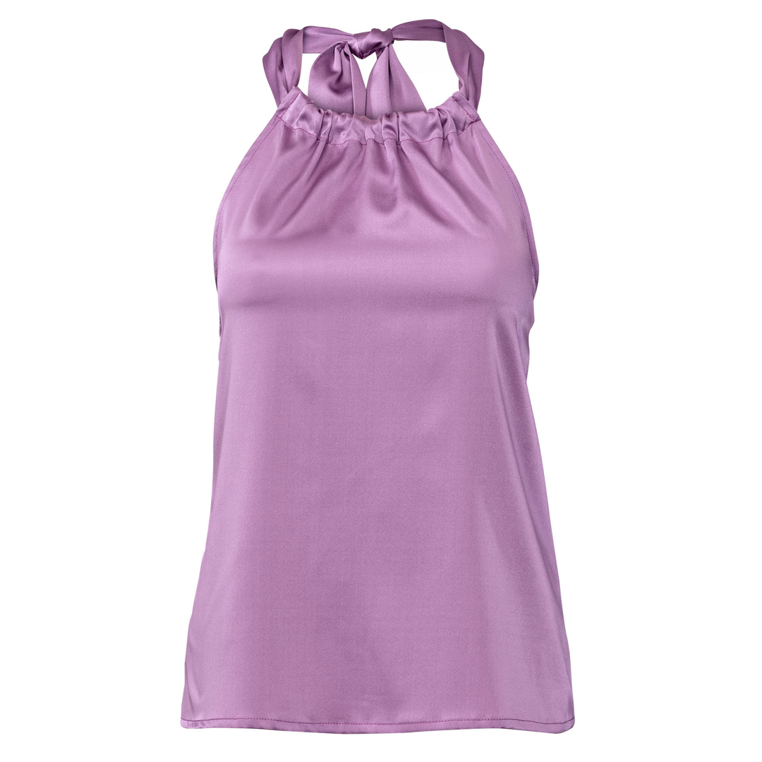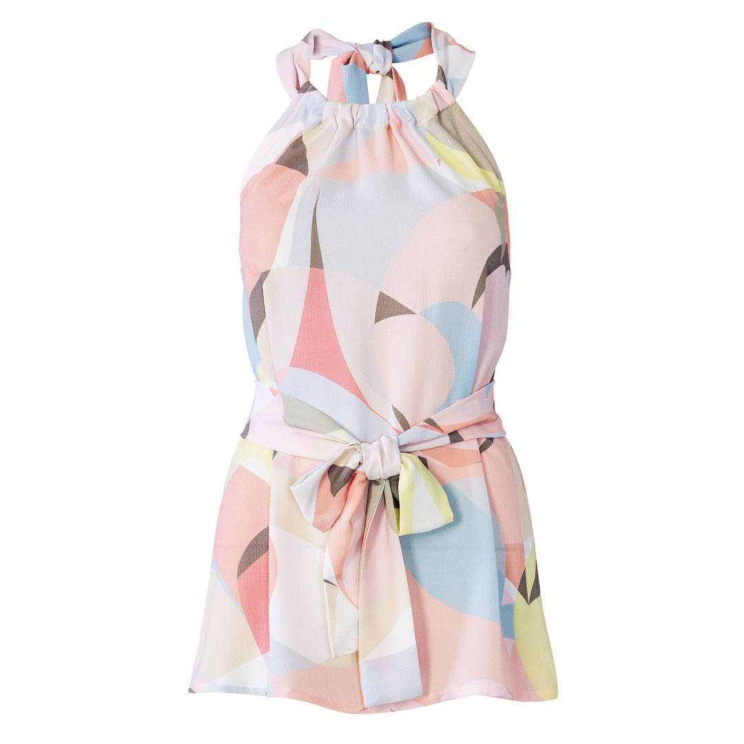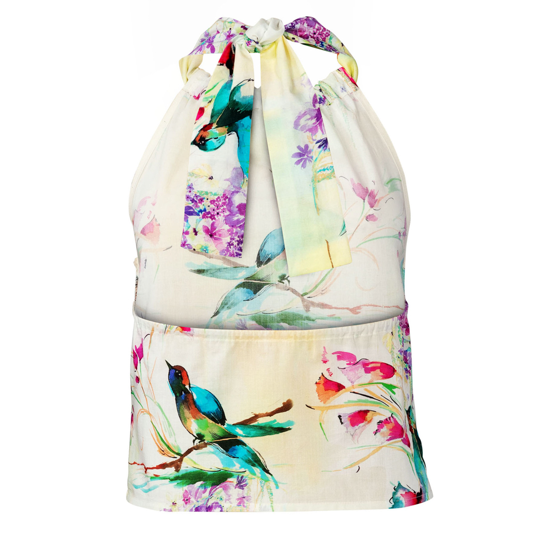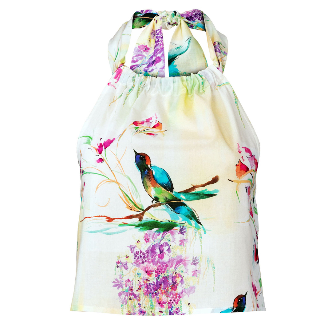 Fun halter tops in tre diverse lunghezze. Vista A è leggermente corto, vist B è di lunghezza regolare, vista C copre i fianchi ed ha una stringa da annodare. Tutti e tre sono elasticizzati sul retro per una buona vestibilità ed hanno una fascia dello stesso tessuto per annodare la parte anteriore dietro il collo.
