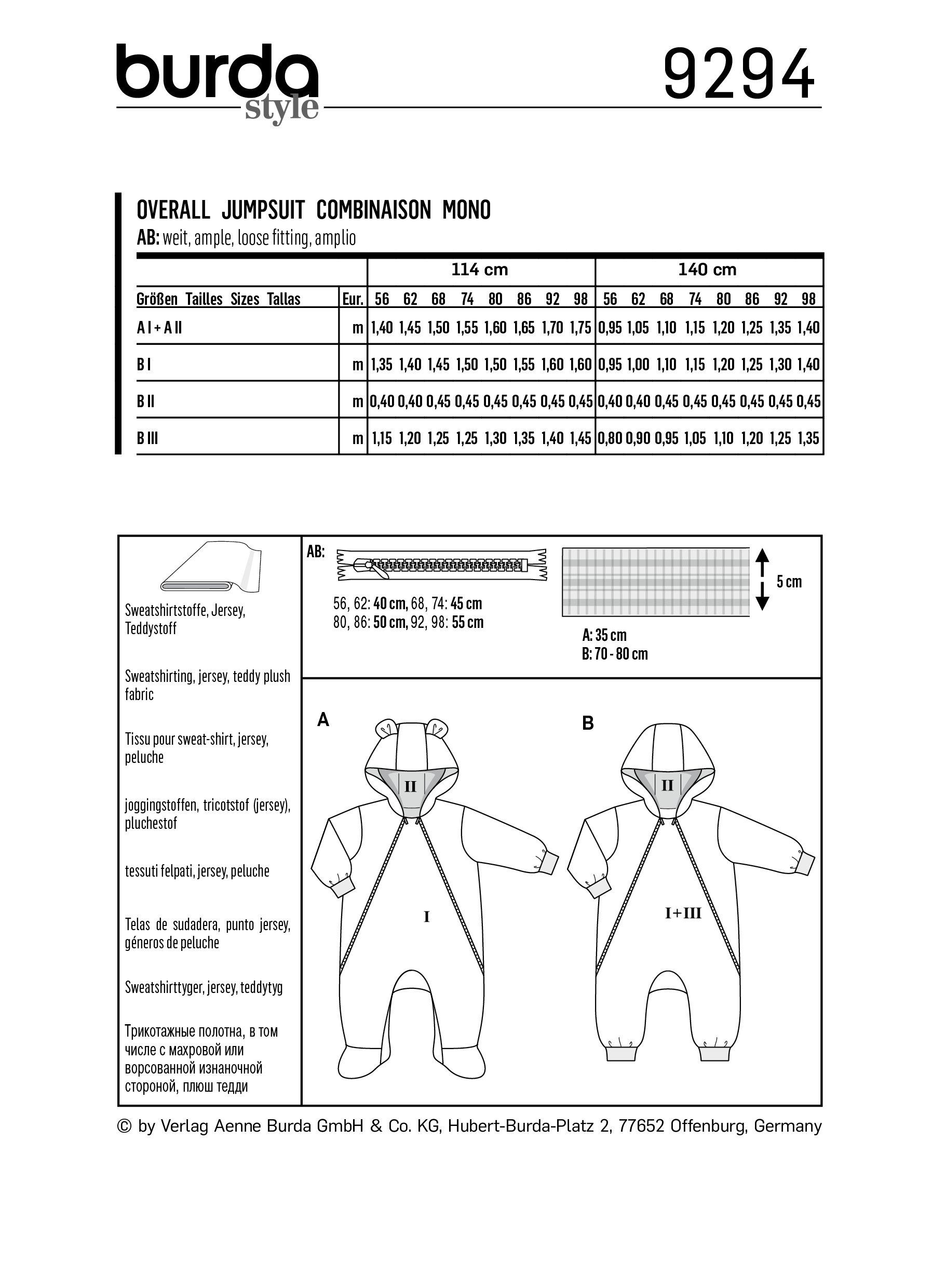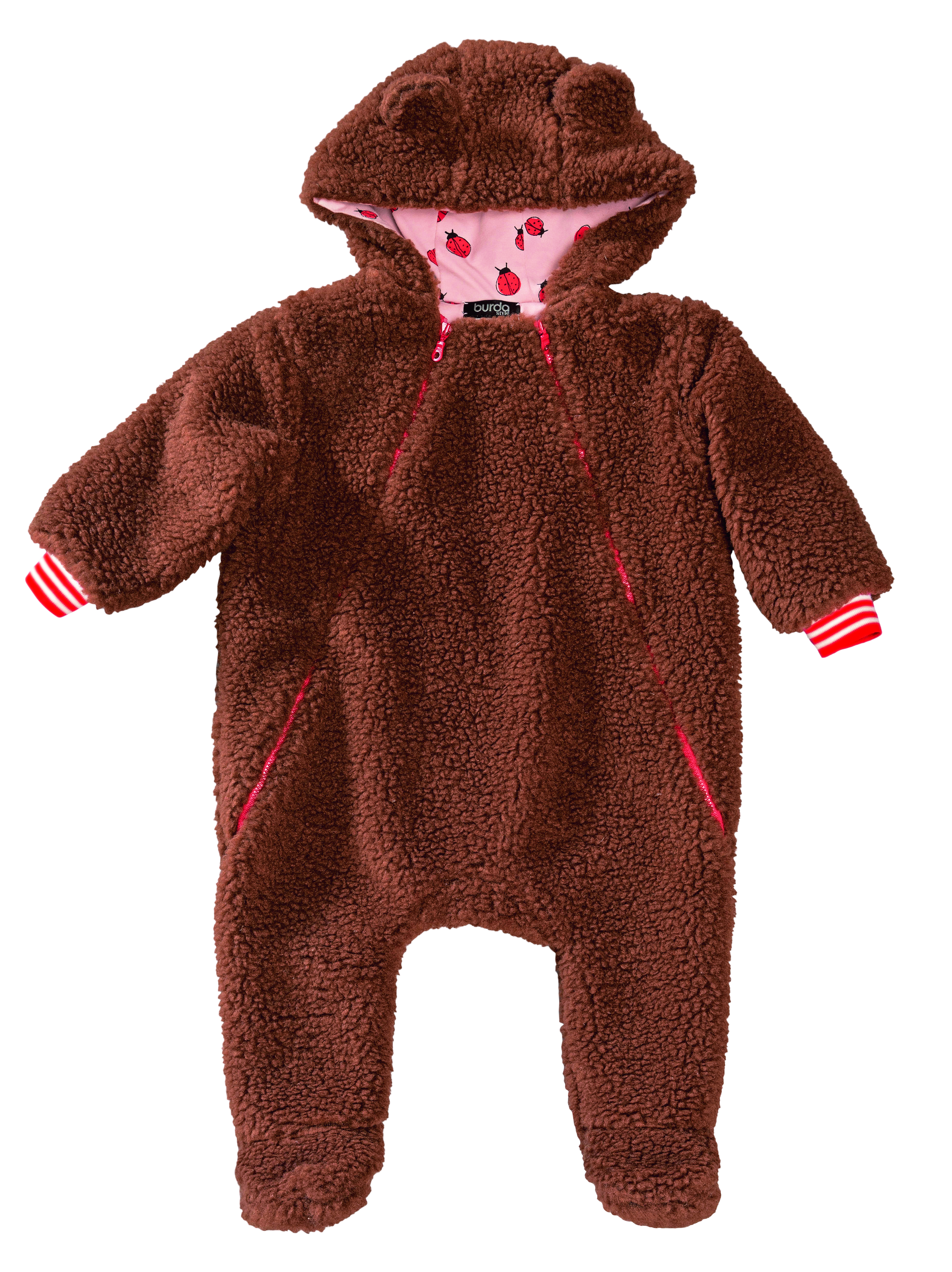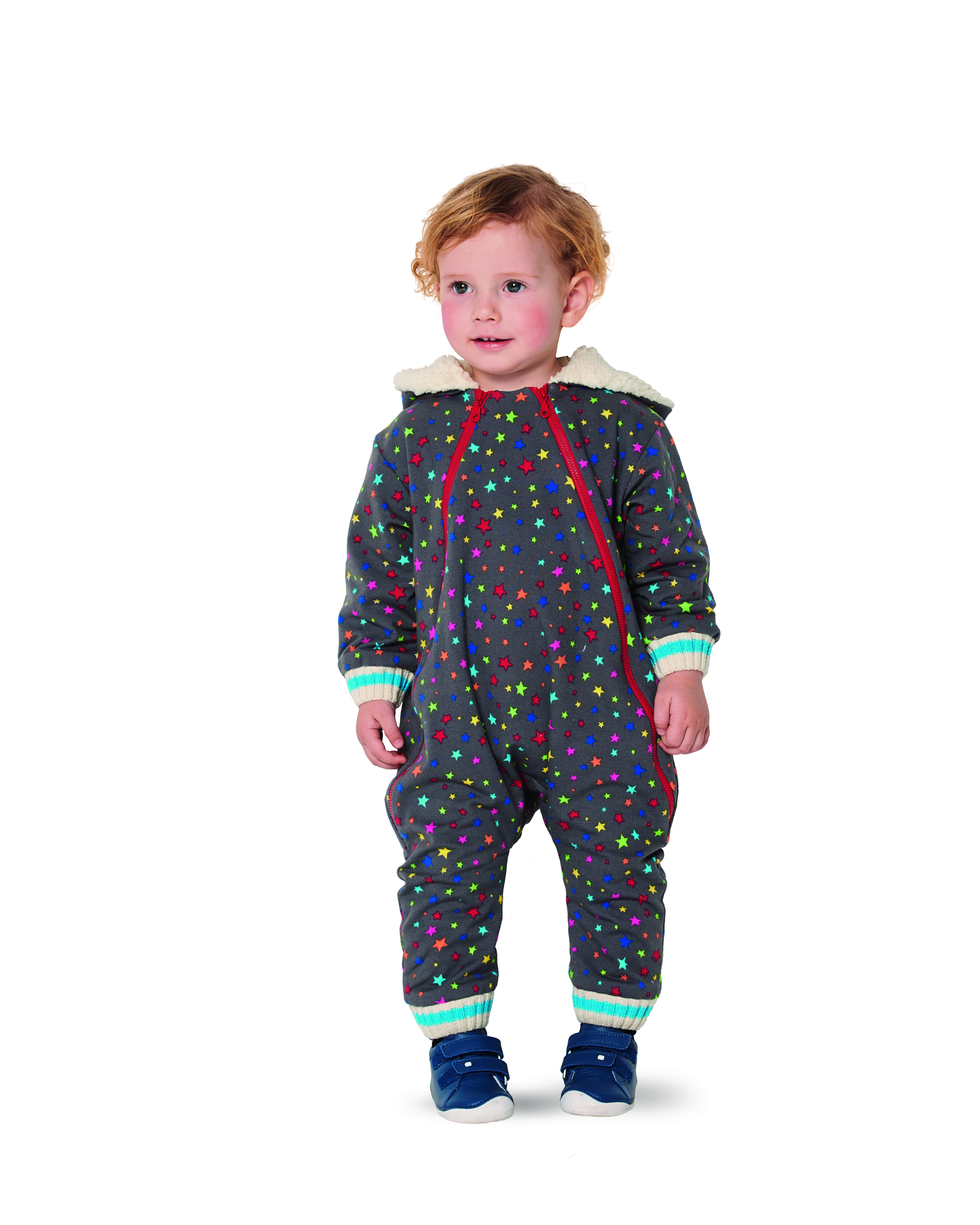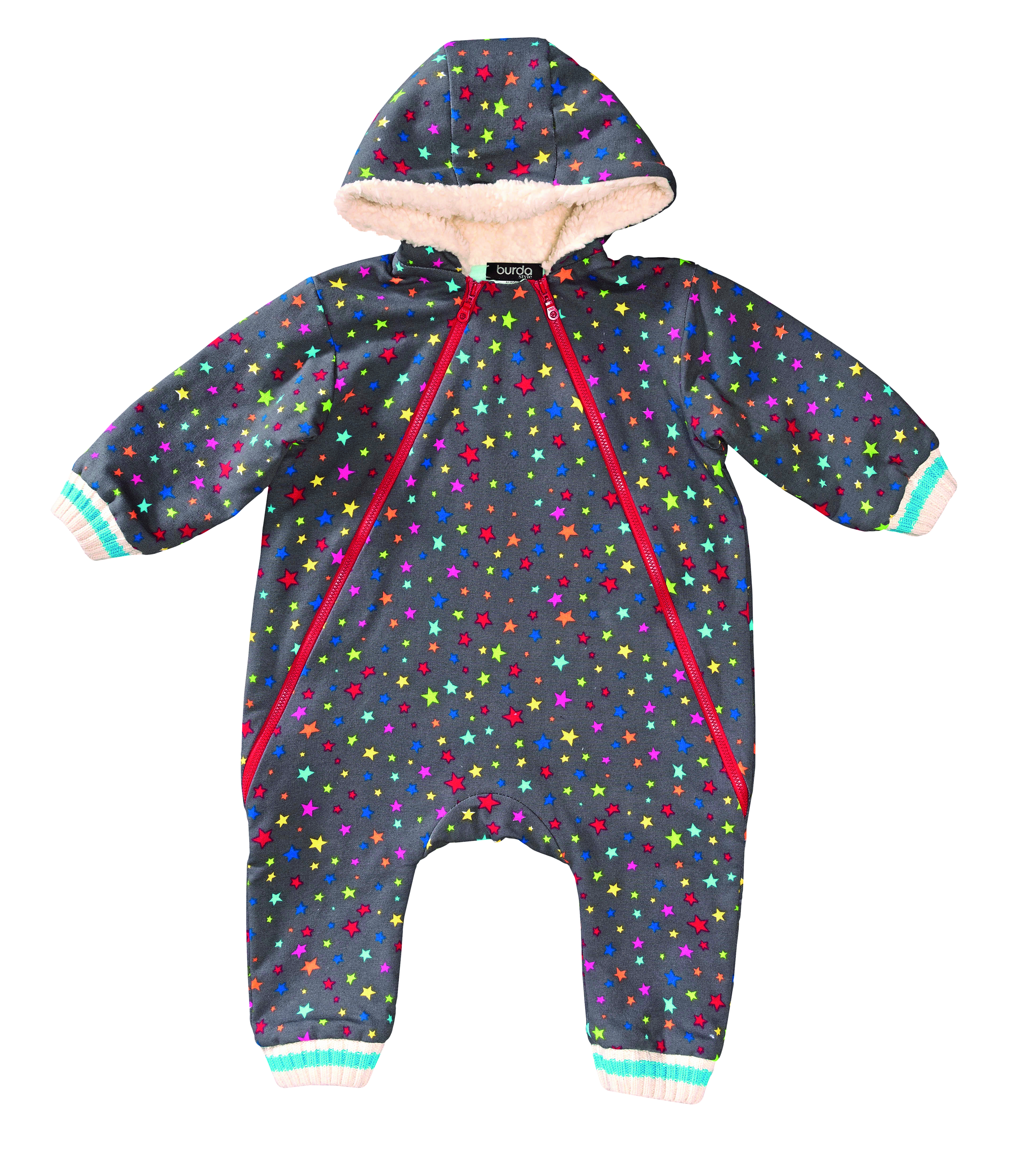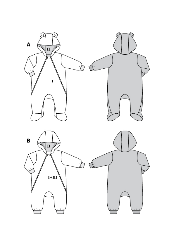 Le pratiche tute con cappuccio manterranno i nostri piccoli comodi e comodi. Entrambi sono doppi con tessuto a contrasto e hanno due lunghe cerniere per facilitare l'ingresso e l'uscita. Scegli tra piedi chiusi o fasce per le gambe. Tessuti consigliati: felpa, jersey, tessuto peluche teddy