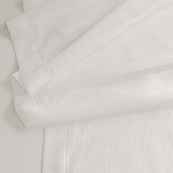 DescrizioneTessuto in poliestere di media-leggera pesantezza in altezza 3,30 metri, di color bianco naturale con trama irregolare. La tenda dona alle stanze nella quale viene applicata moltissima luce.
